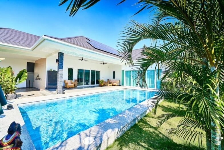 This modern, light-filled 3-bedroom, 3-bathroom pool villa was completed in June 2022 and is located just 10 minutes from Hua Hin town centre and the beach. The villa is designed around a private 9 x 4 metre saltwater pool, creating a perfect balance of indoor-outdoor living. The covered terrace provides ample shade for relaxing and entertaining, while the tropical garden adds a serene touch of greenery.